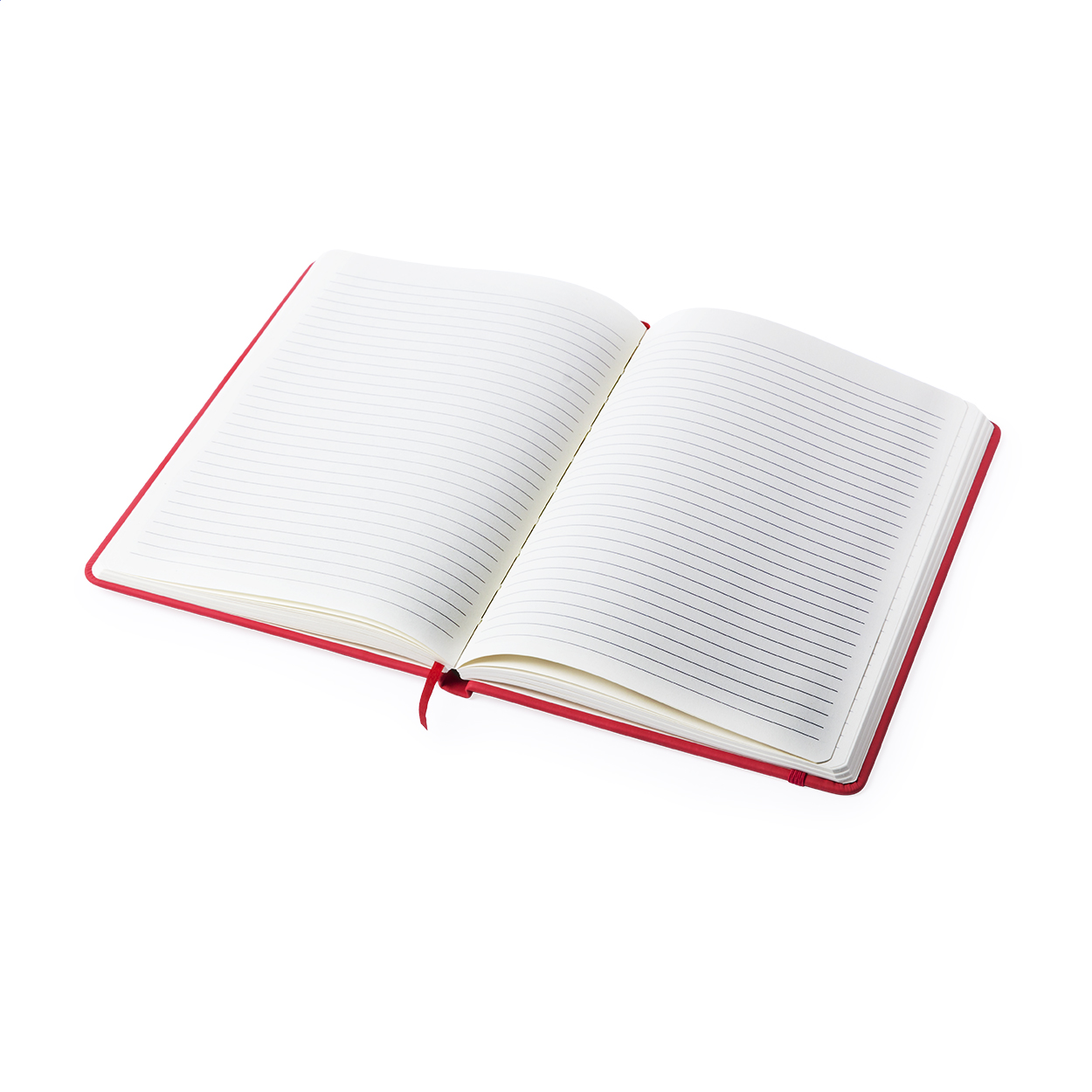 Quaderno con rivestimento pelle PU, 100 fogli a righe, segnalibro e cinturino in gomma coordinati.