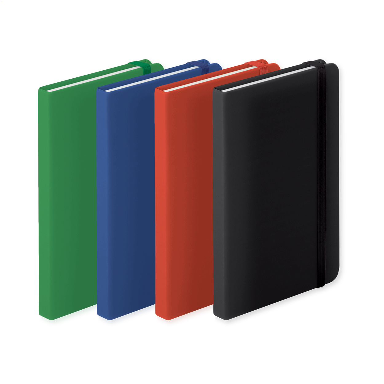 Quaderno con rivestimento in finta pelle, 100 fogli a righe, segnalibro e cinturino in gomma coordinati. Formato A6.