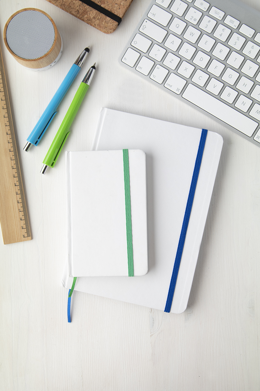Quaderno formato A5 con copertina in cartoncino bianco e 100 fogli bianchi, costa del quaderno e cinturino in gomma in colore coordinato.