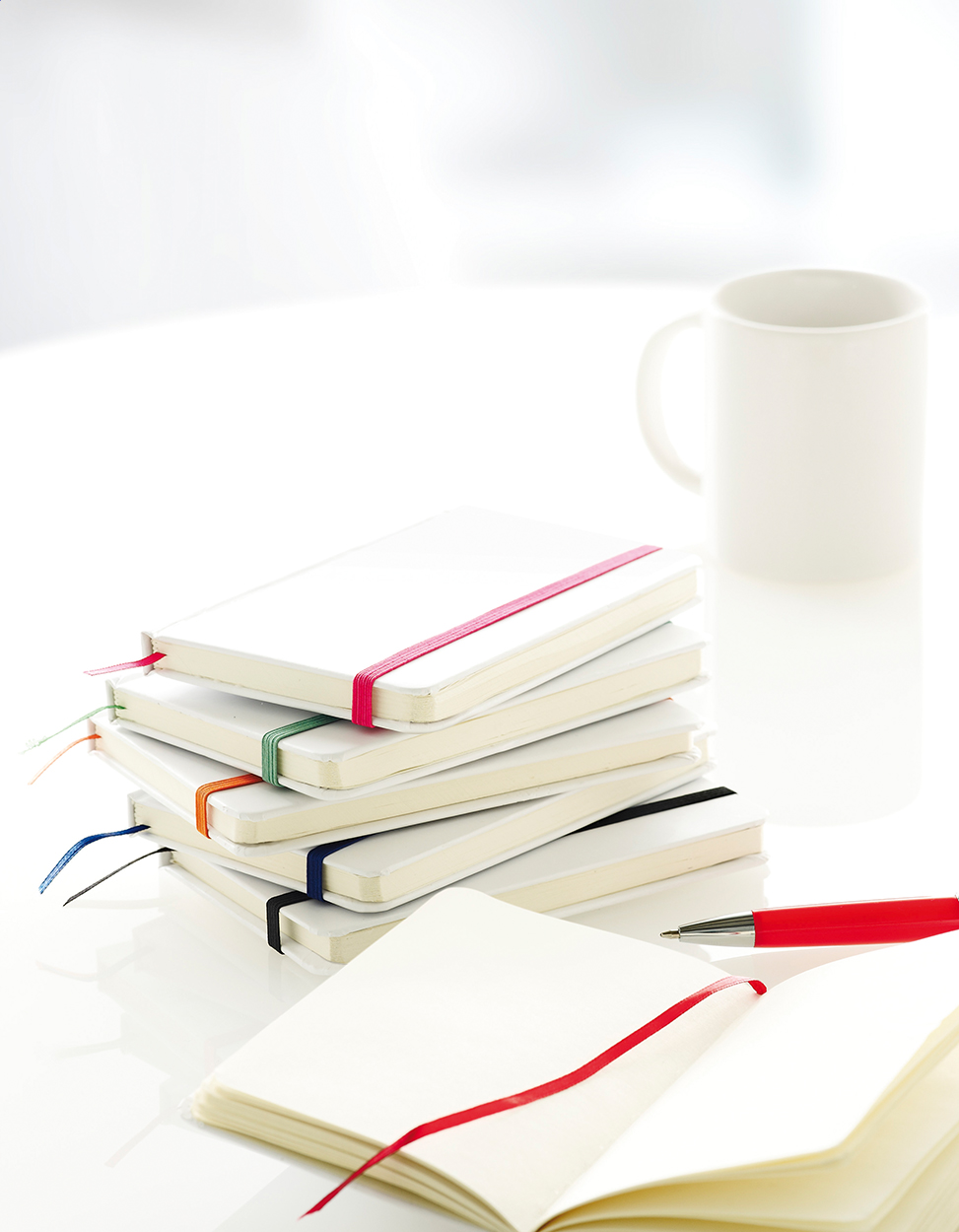 Quaderno con copertina in cartoncino da 80 fogli bianchi ed elastico chiusura colorato. Formato A6.