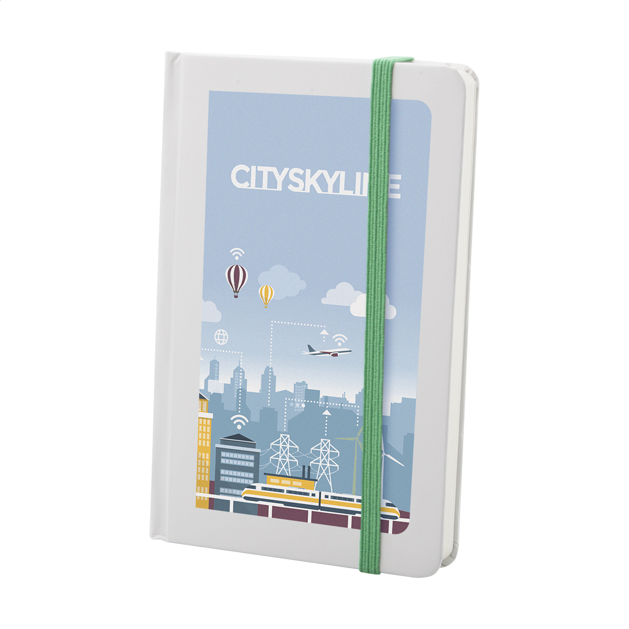 Quaderno con copertina in cartoncino da 80 fogli bianchi ed elastico chiusura colorato. Formato A6.
