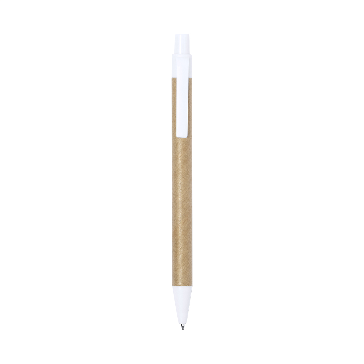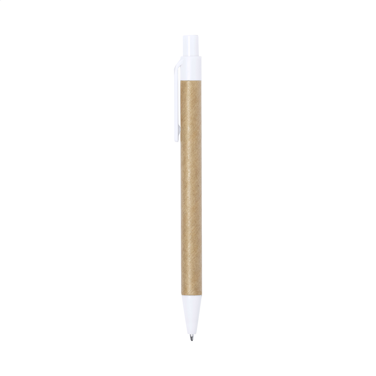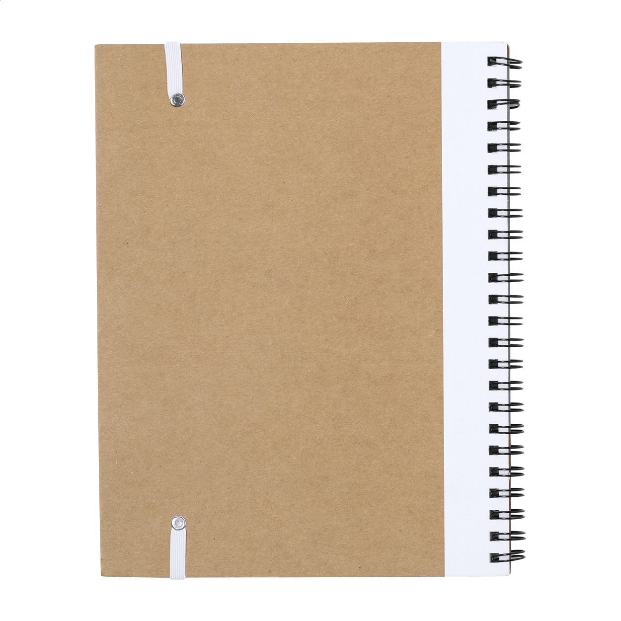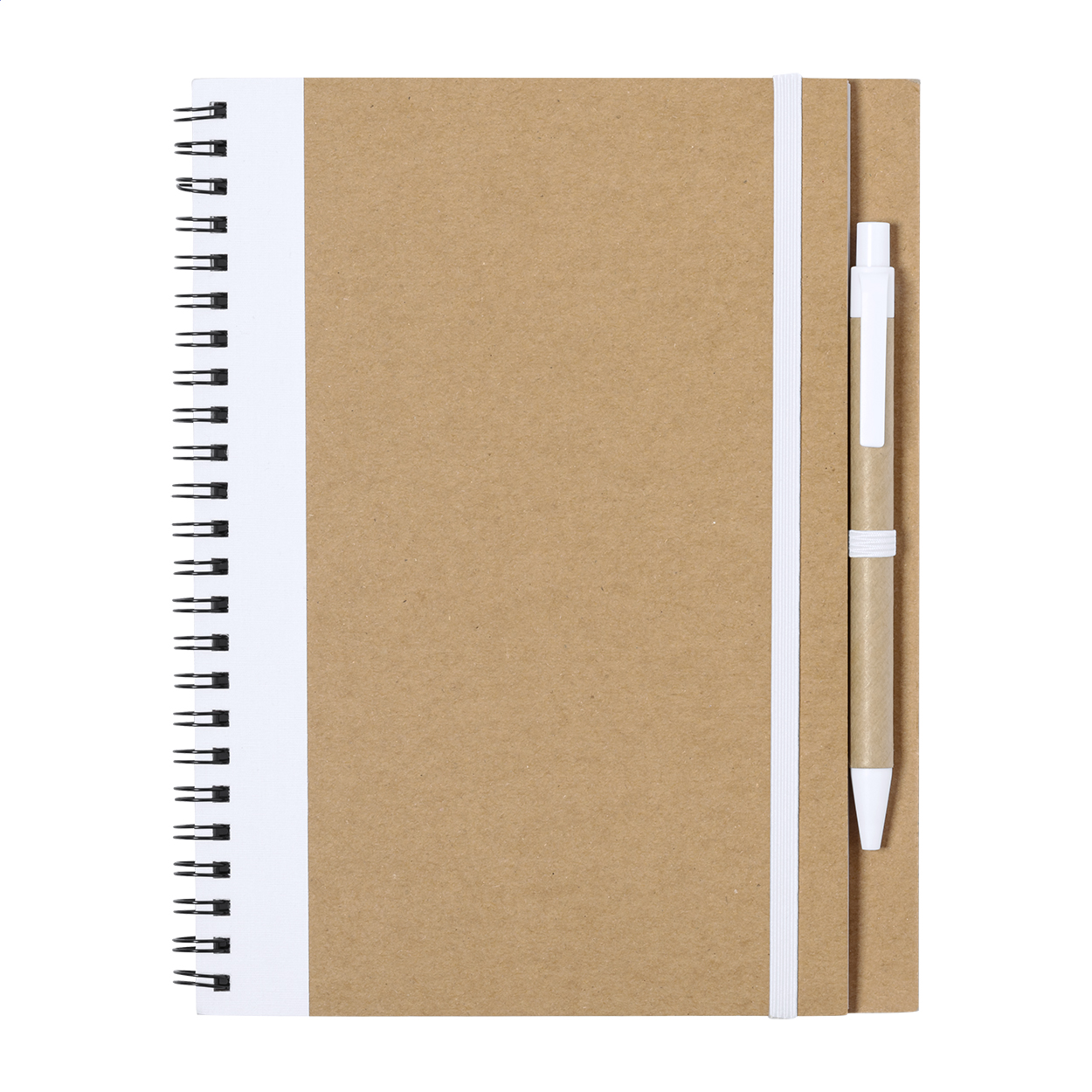 Quaderno con copertina in carta riciclata, 60 fogli bianchi e penna a sfera.