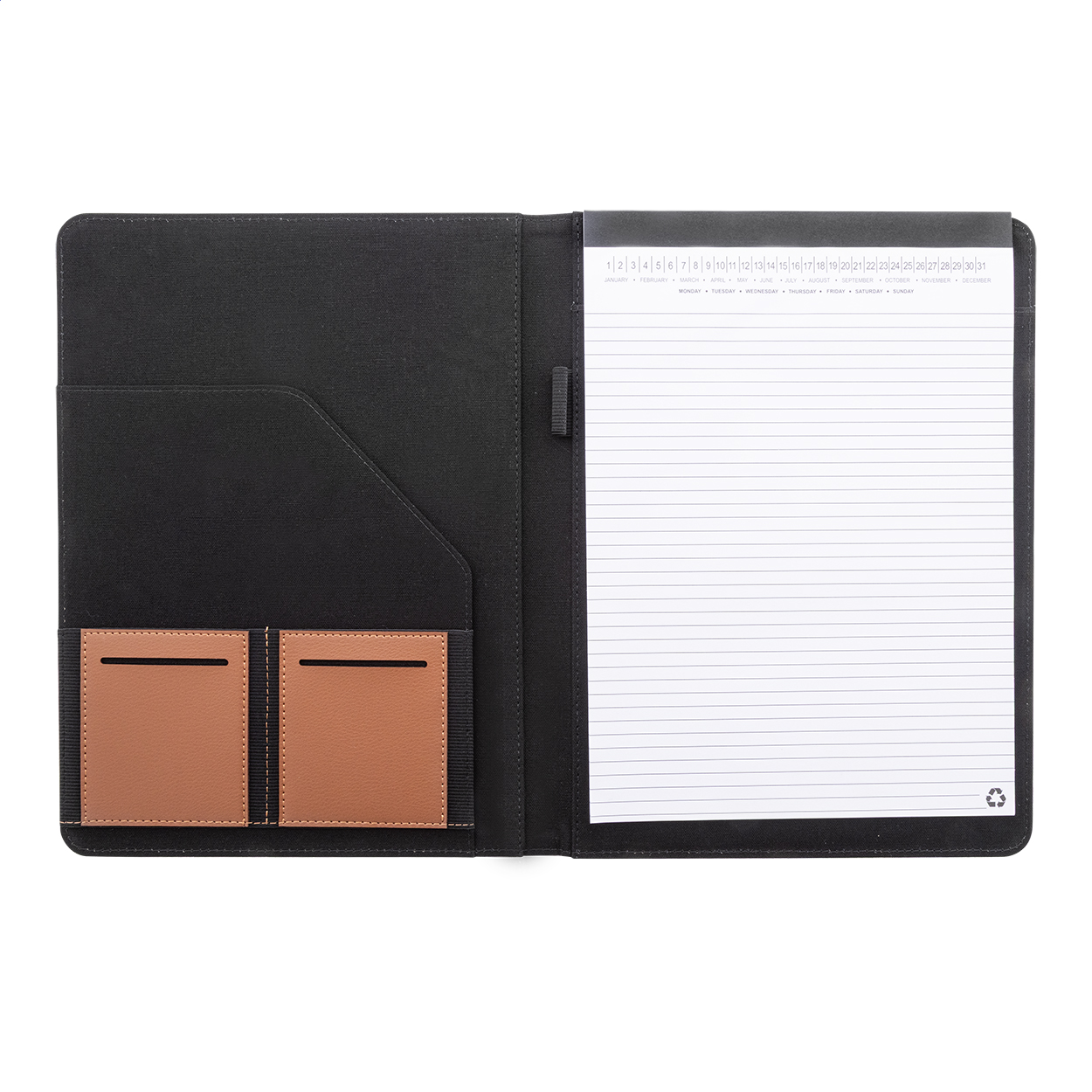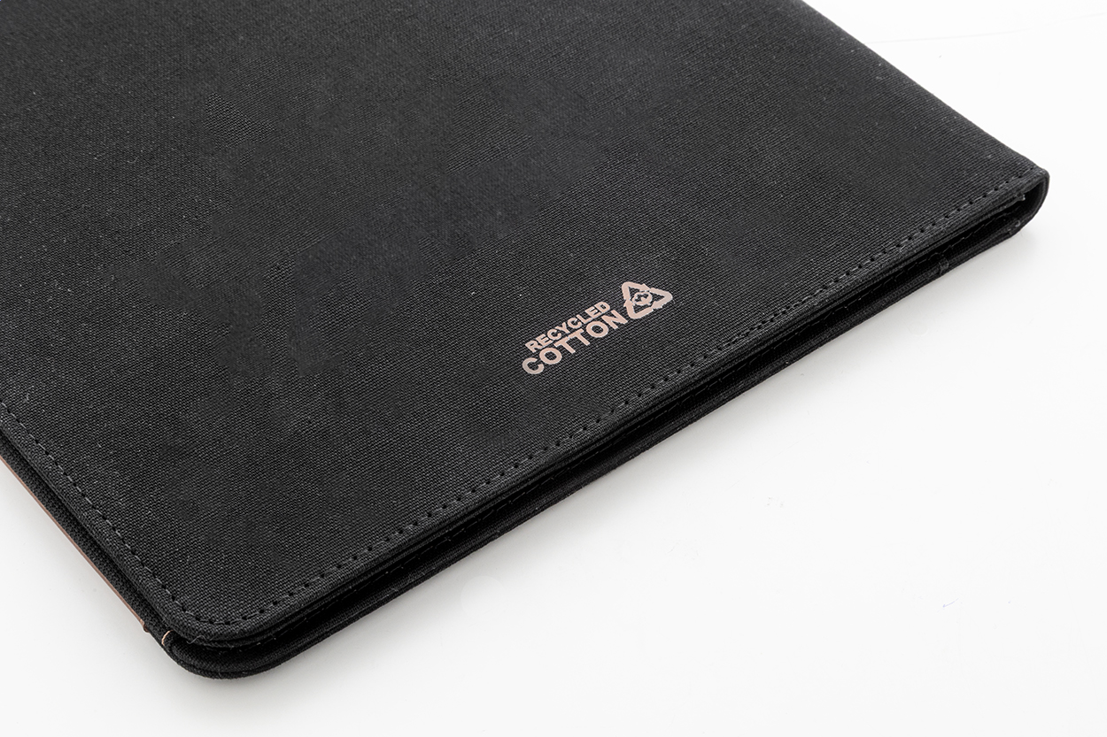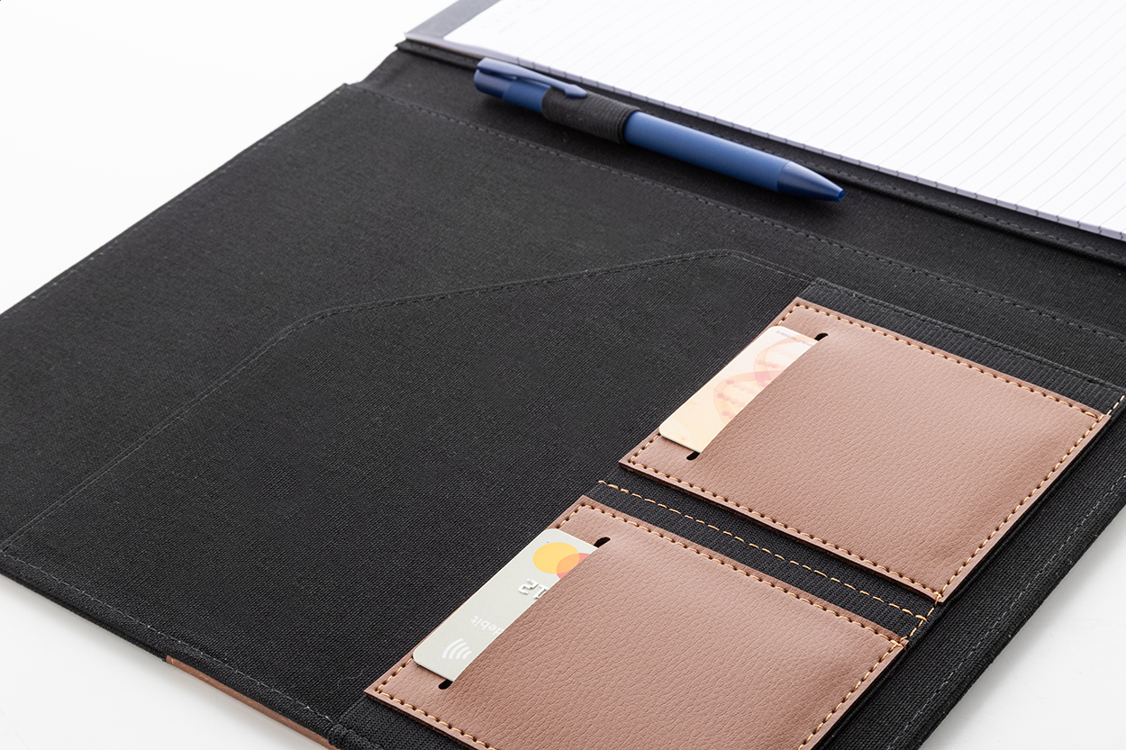 Cartella portadocumenti in canvas e pelle PU riciclata, formato A4, con molteplici tasche organizer interne e frontali, e blocco da 20 fogli a righe in carta riciclata. 70% cotone riciclato e 30% poliestere RPET.