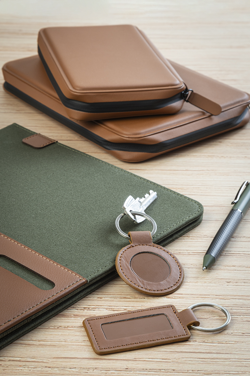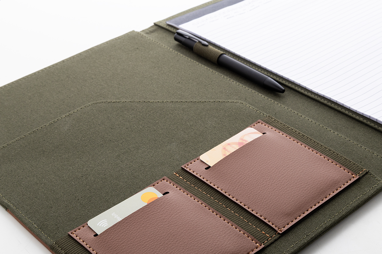 Cartella portadocumenti in canvas e pelle PU riciclata, formato A4, con molteplici tasche organizer interne e frontali, e blocco da 20 fogli a righe in carta riciclata. 70% cotone riciclato e 30% poliestere RPET.