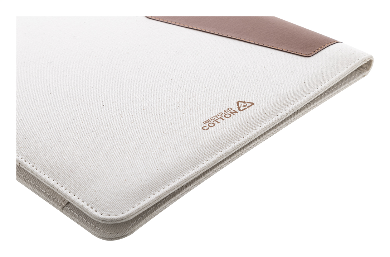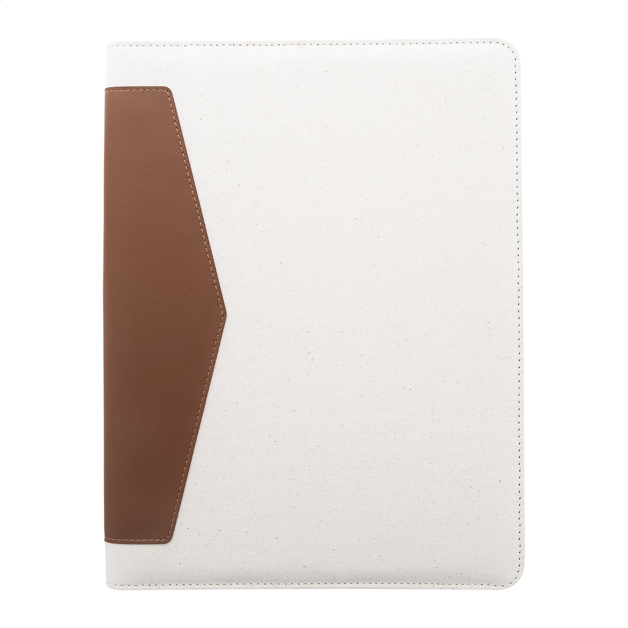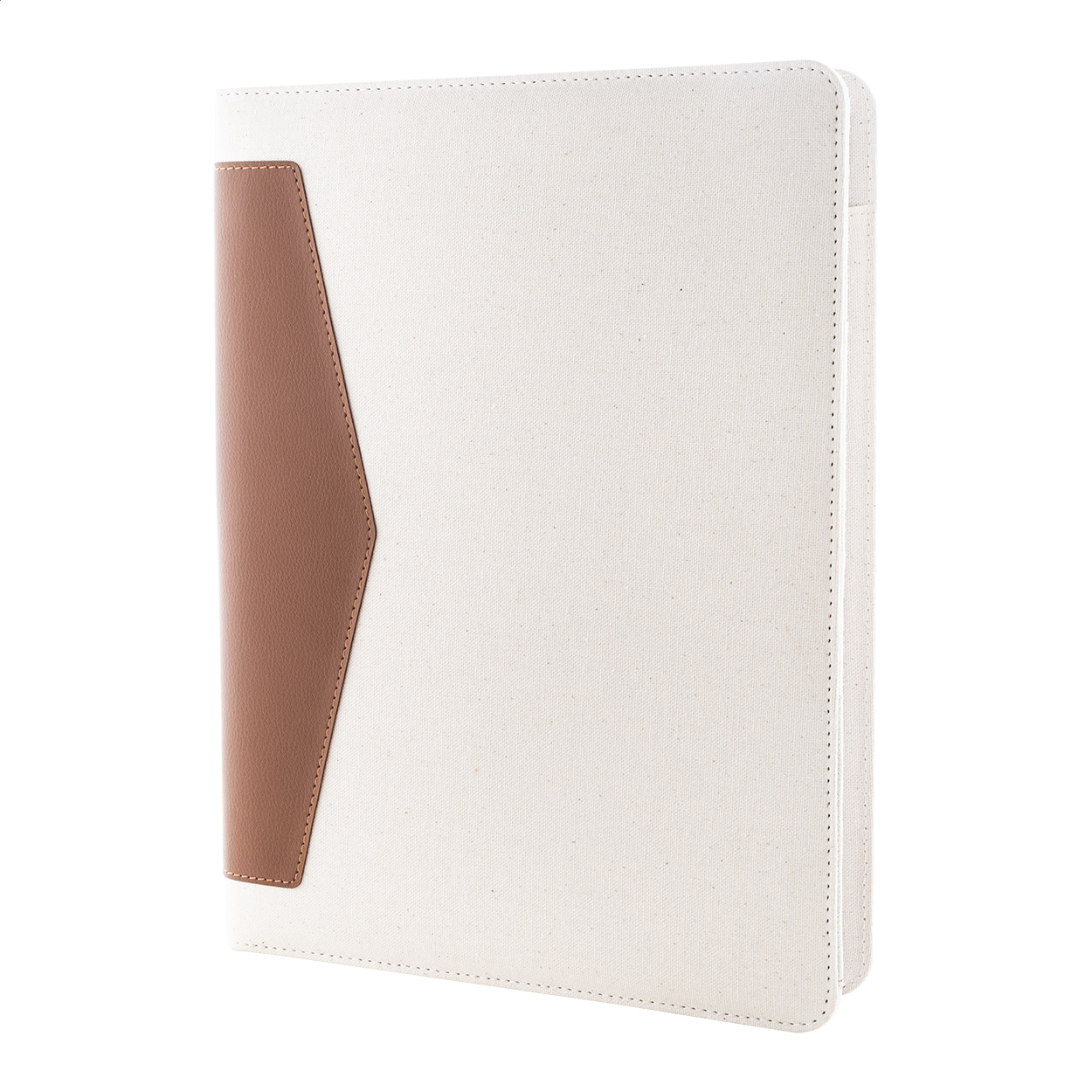 Cartella portadocumenti formato A4 in canvas riciclato e pelle PU riciclata, molteplici scomparti interni e blocco note da 20 fogli in carta riciclata a righe. Materiale: 70% cotone riciclato e 30% poliestere RPET.