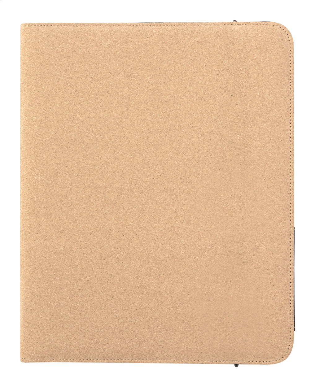 Cartella portadocumenti in sughero naturale con blocco note da 20 fogli a righe e multiple tasche interne.