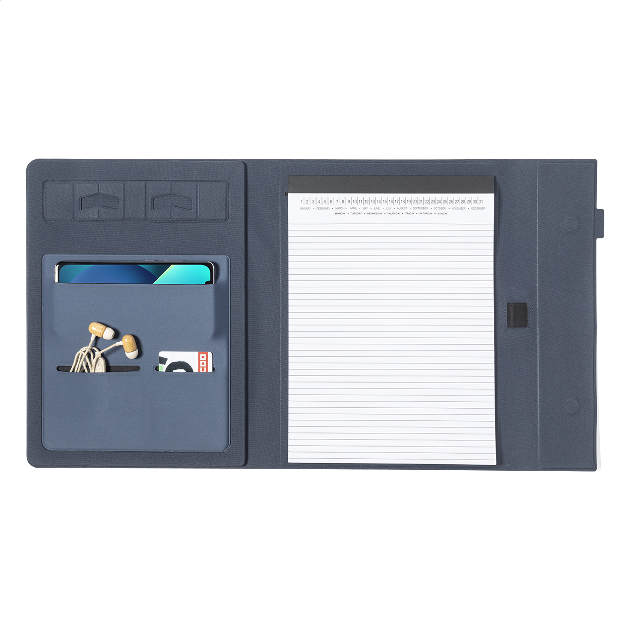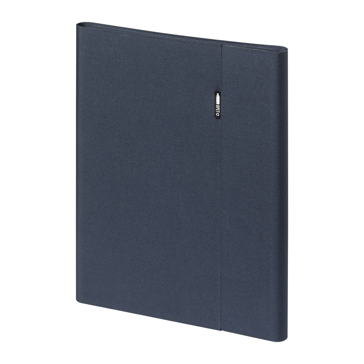 Cartella portadocumenti formato A4 in poliestere 600D RPET, con chiusura magnetica, portacellulare pieghevole, blocco note da 20 fogli a righe ed etichetta RPET.