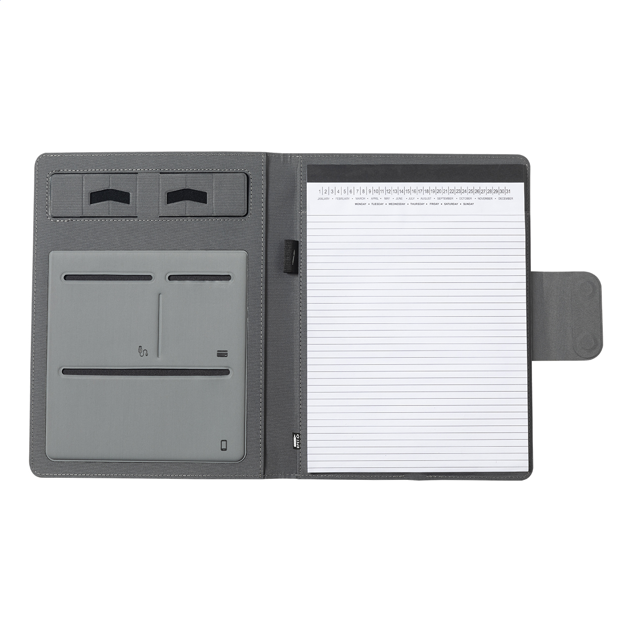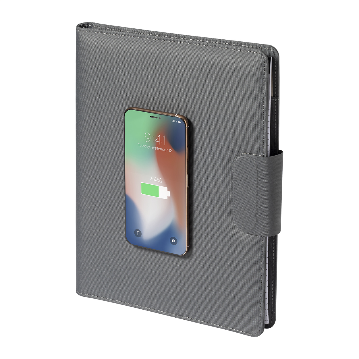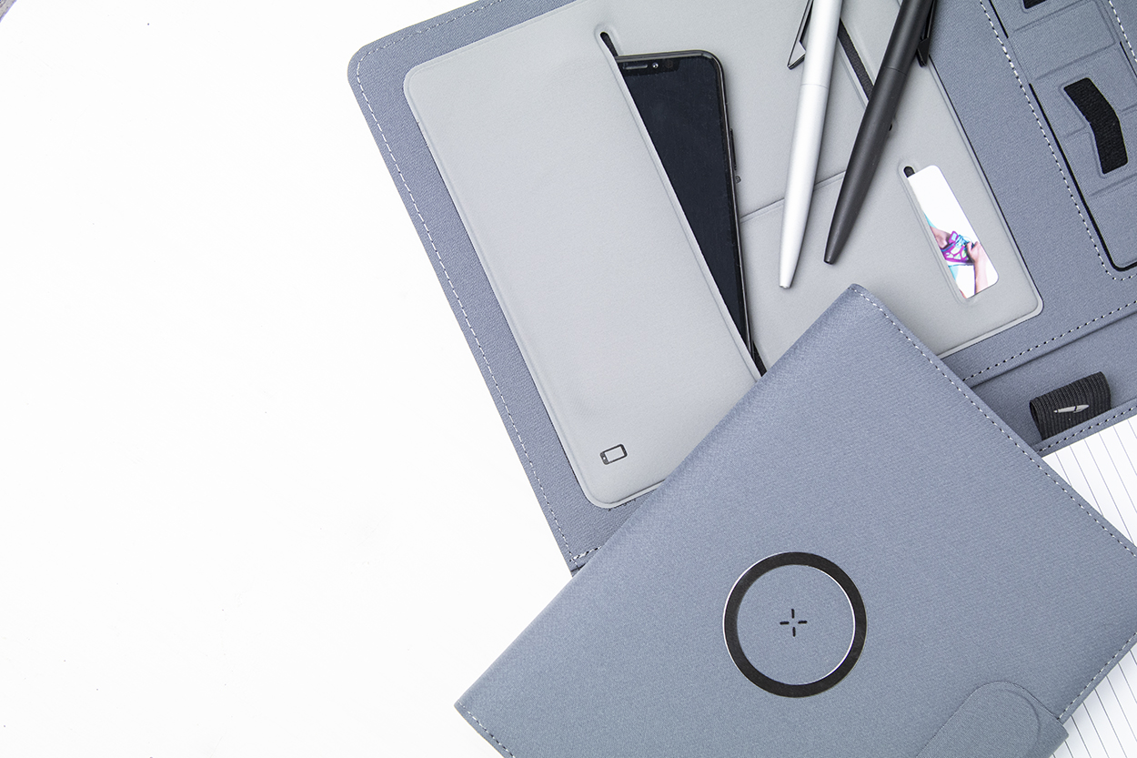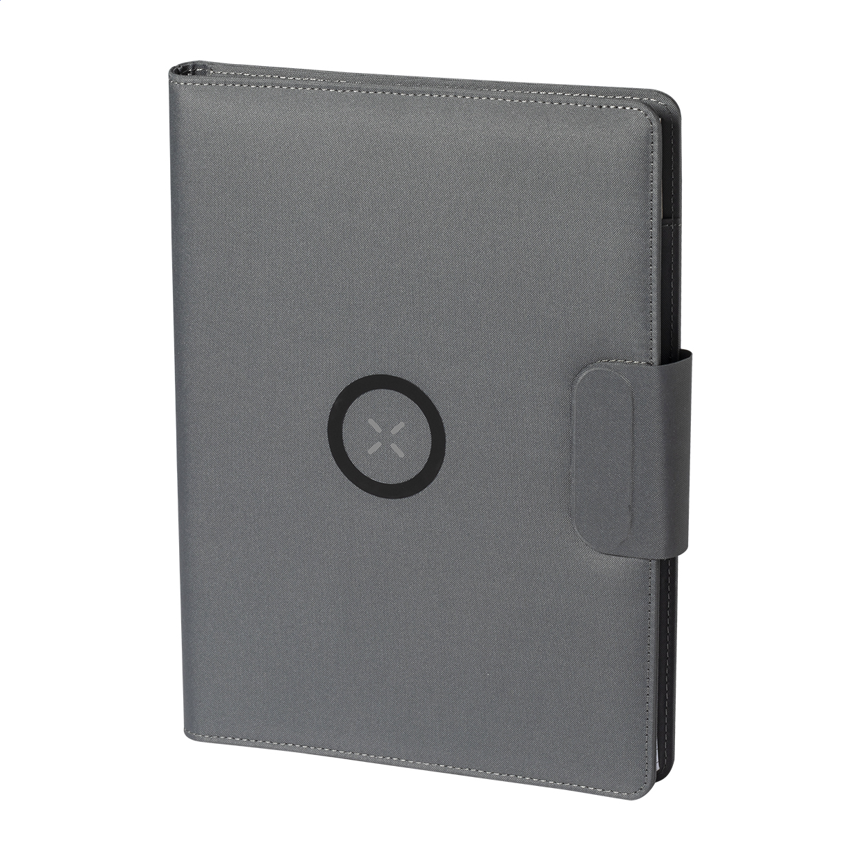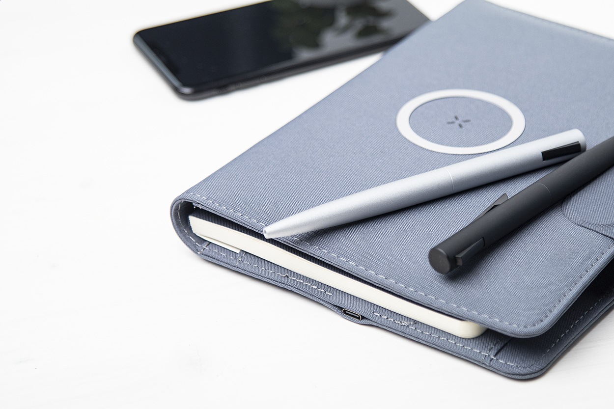 Cartella portadocumenti formato A4 in poliestere 300D RPET, con caricabatterie magnetico wireless rapido integrato (10W), power bank da 5000 mAh con porta di ricarica USB, supporto pieghevole per cellulare e blocco note da 20 fogli a righe. Comprende un anello metallico autoadesivo che permette l'utilizzo della funzione magnetica su qualsiasi dispositivo ricaricabile in modalità wireless. Fornito con cavo USB per la ricarica.