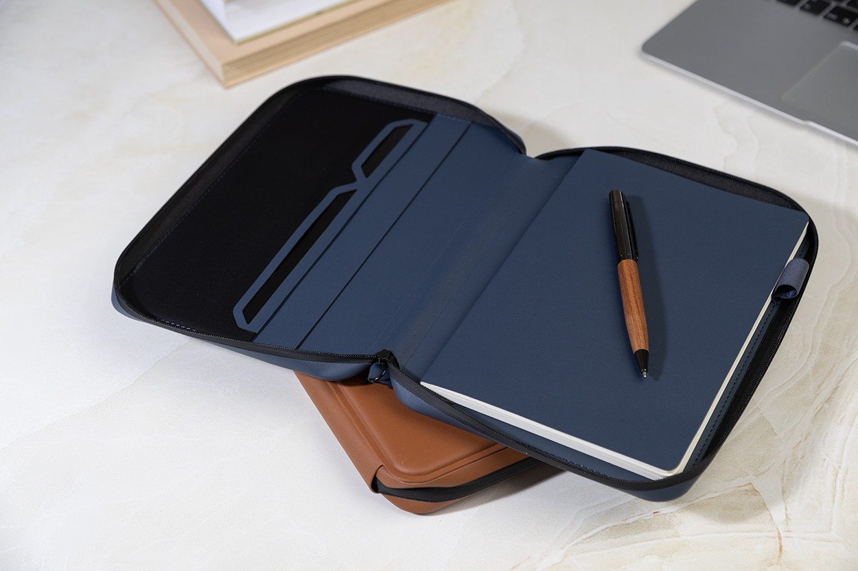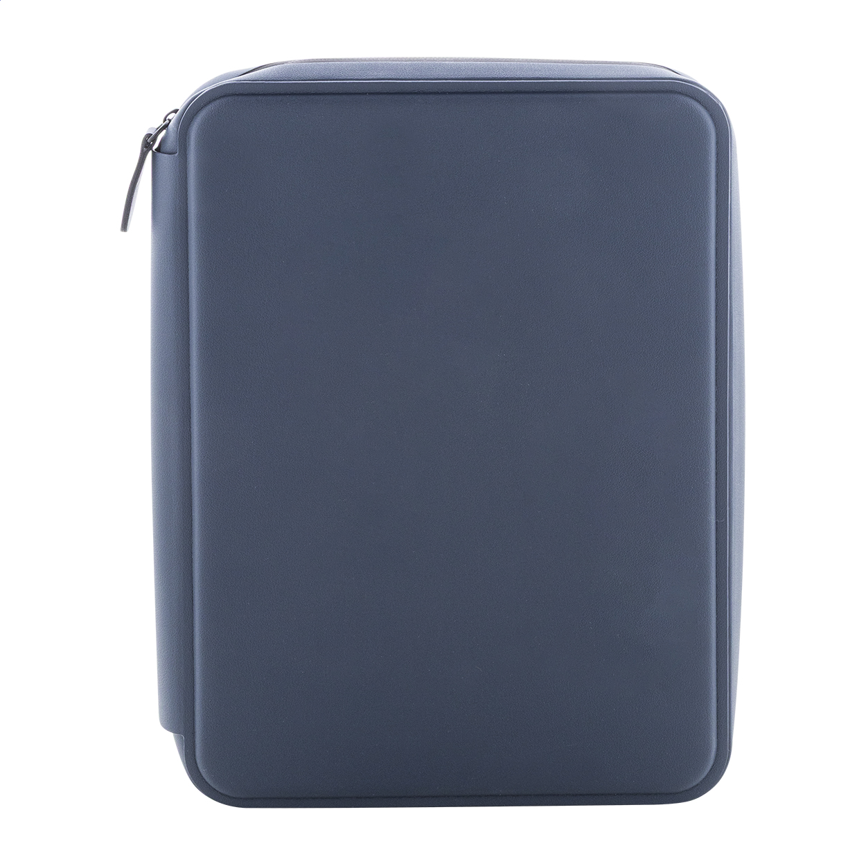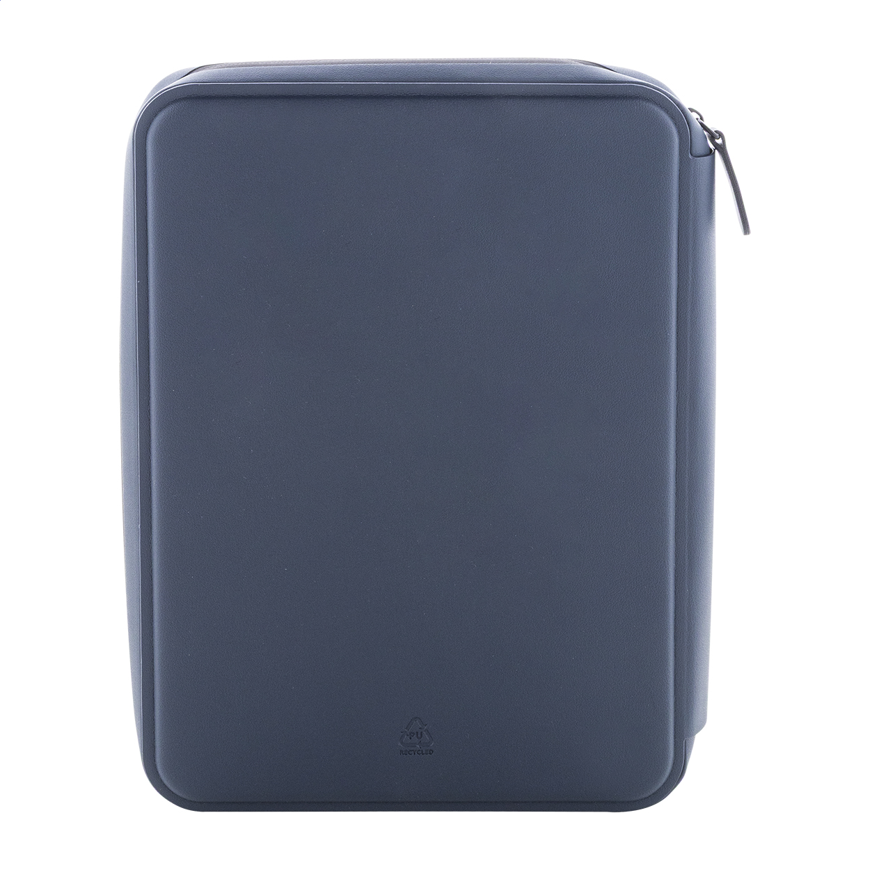 Elegante cartellina portadocumenti in pelle PU riciclata, formato A5, con cerniera e blocco di 64 fogli a righe in carta riciclata. Dotata di molteplici tasche interne per carte e documenti.
