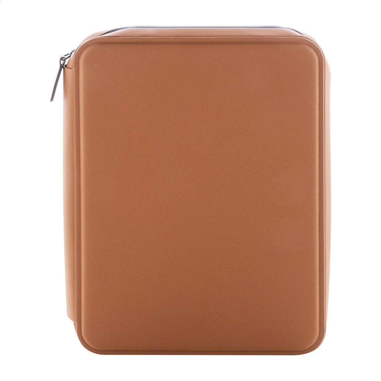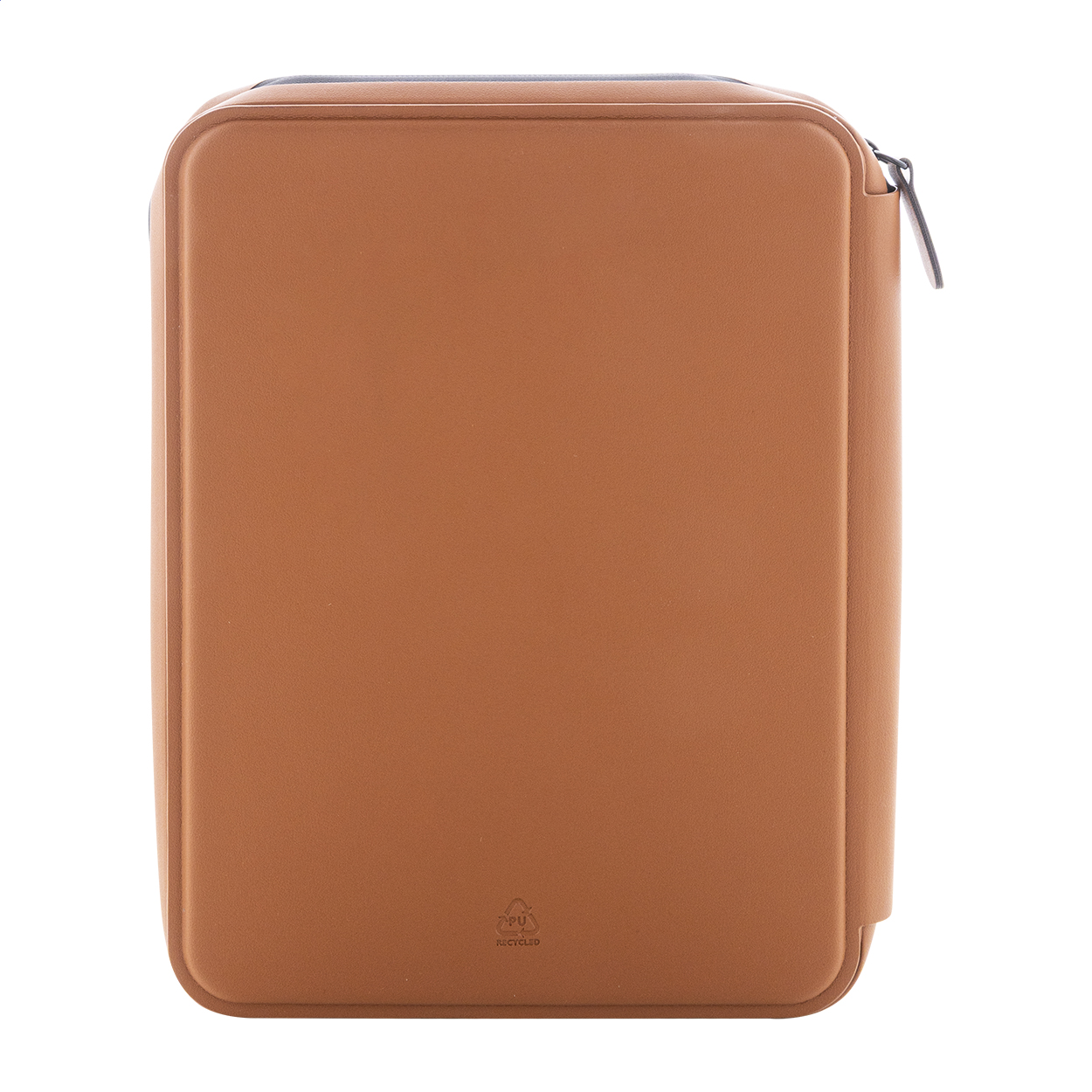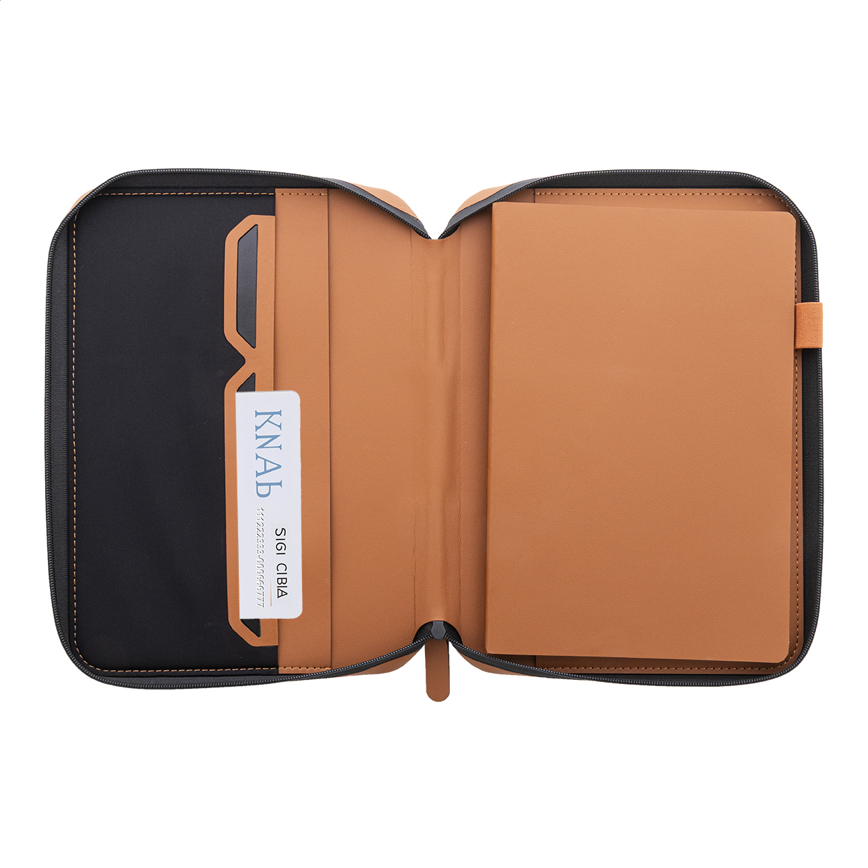 Elegante cartellina portadocumenti in pelle PU riciclata, formato A5, con cerniera e blocco di 64 fogli a righe in carta riciclata. Dotata di molteplici tasche interne per carte e documenti.