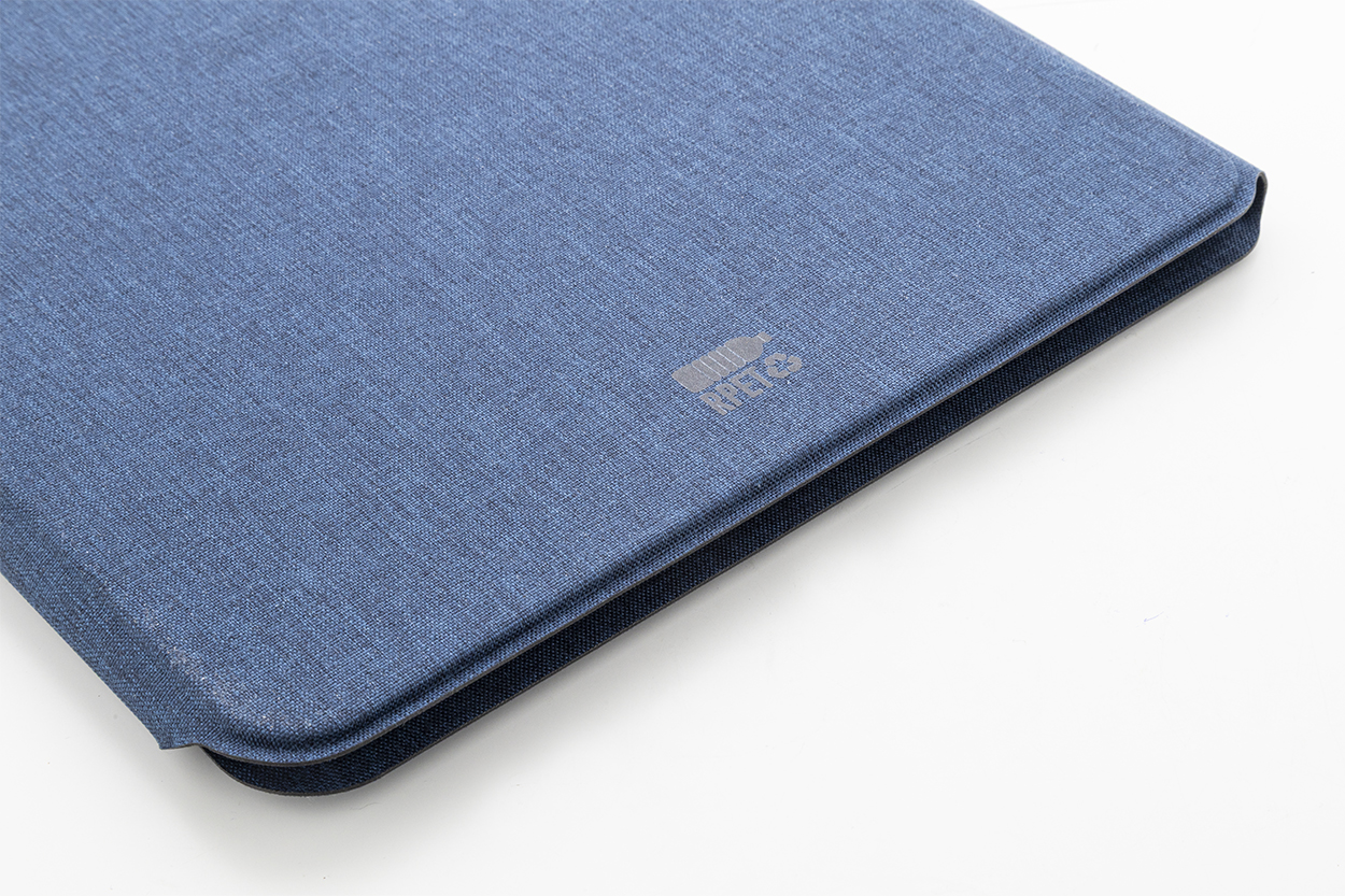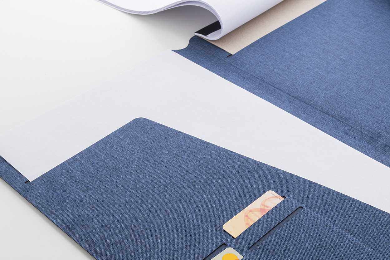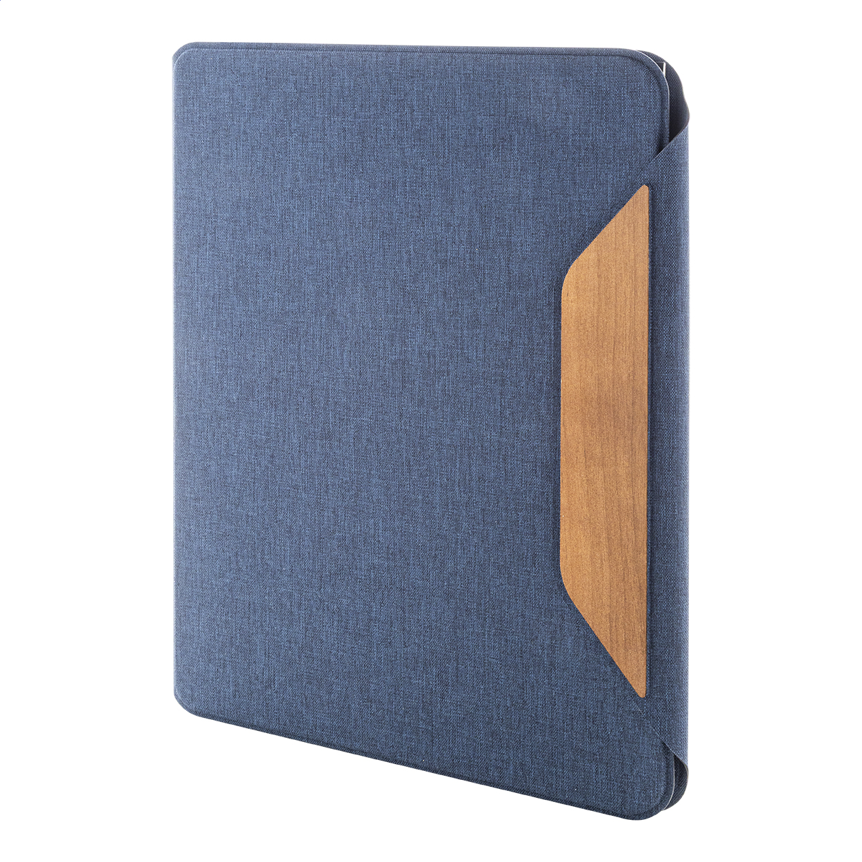 Cartella portadocumenti in poliestere RPET, formato A4, con molteplici tasche organizer interne, chiusura magnetica, dettagli in legno di noce e blocco da 20 fogli a righe in carta riciclata.