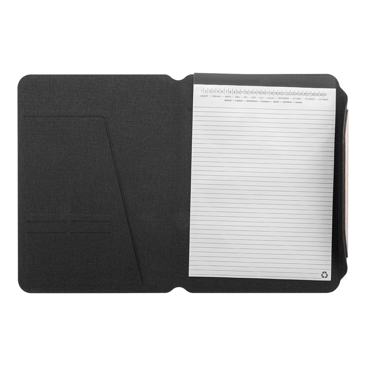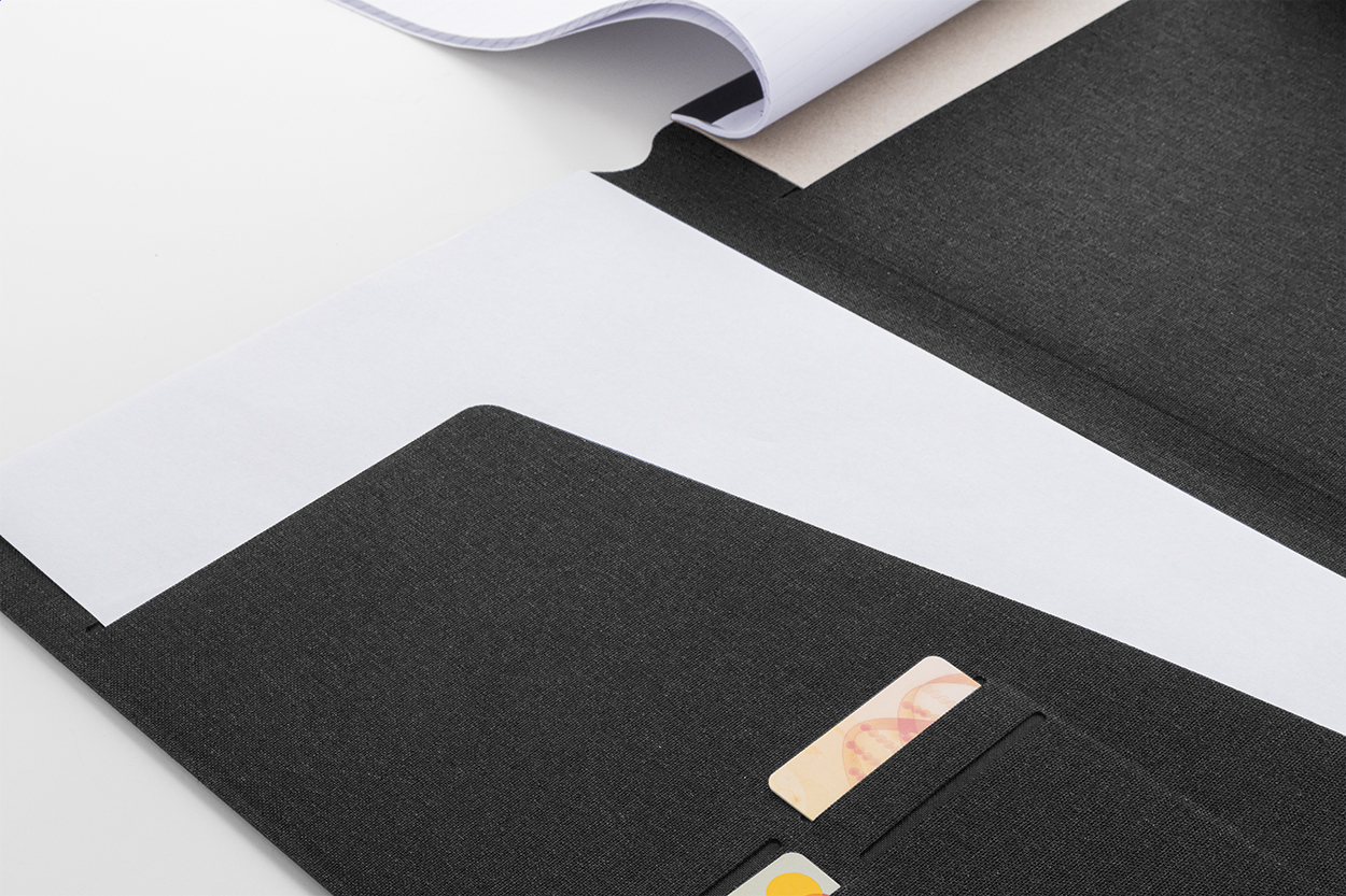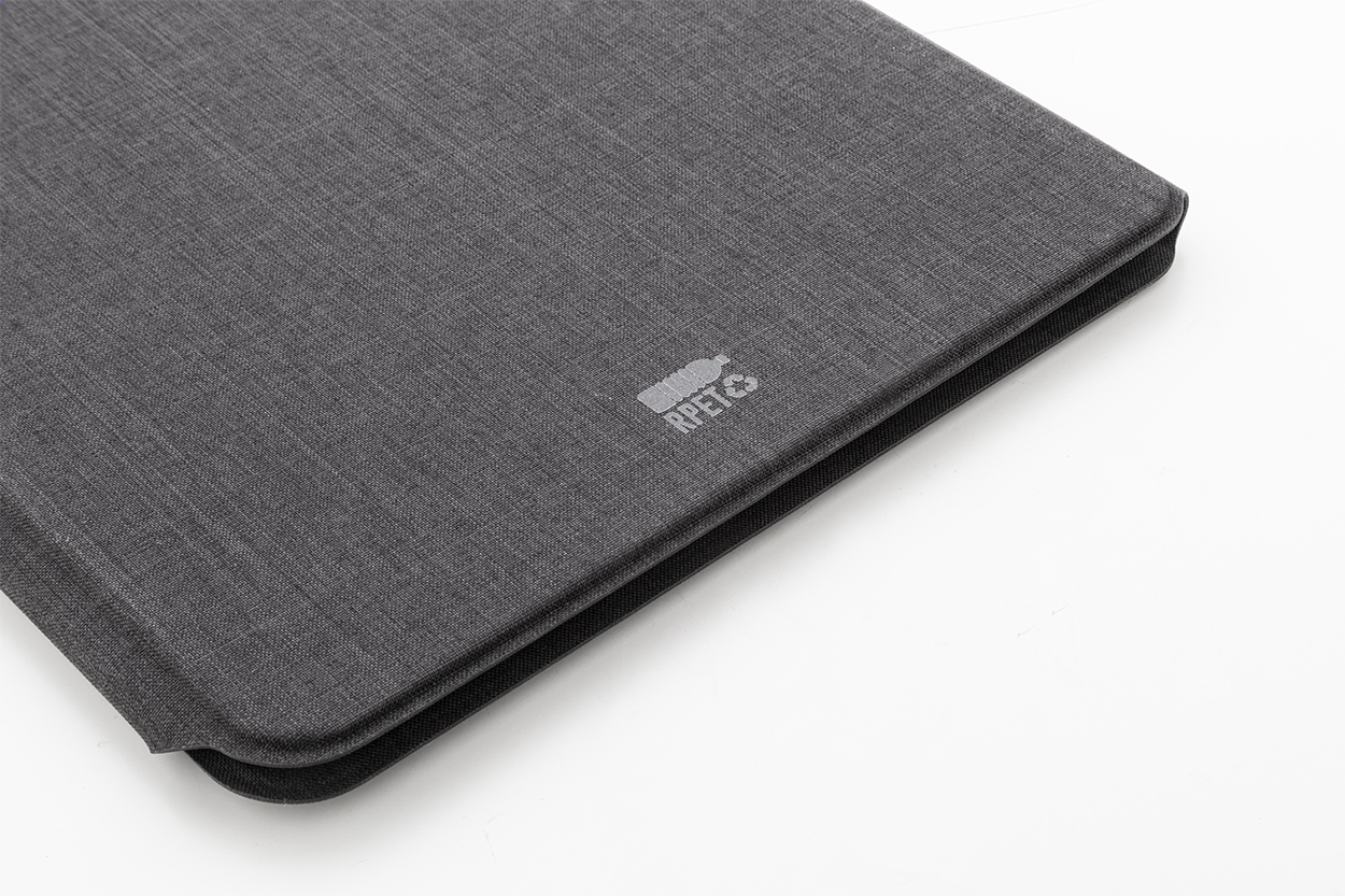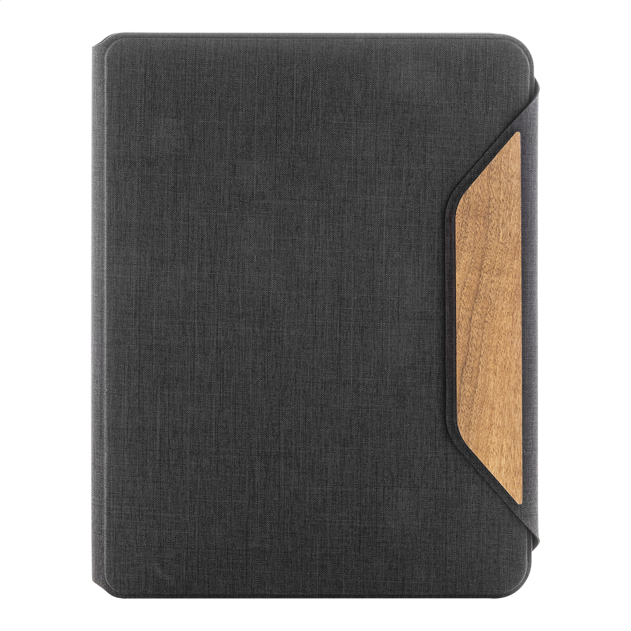 Cartella portadocumenti in poliestere RPET, formato A4, con molteplici tasche organizer interne, chiusura magnetica, dettagli in legno di noce e blocco da 20 fogli a righe in carta riciclata.