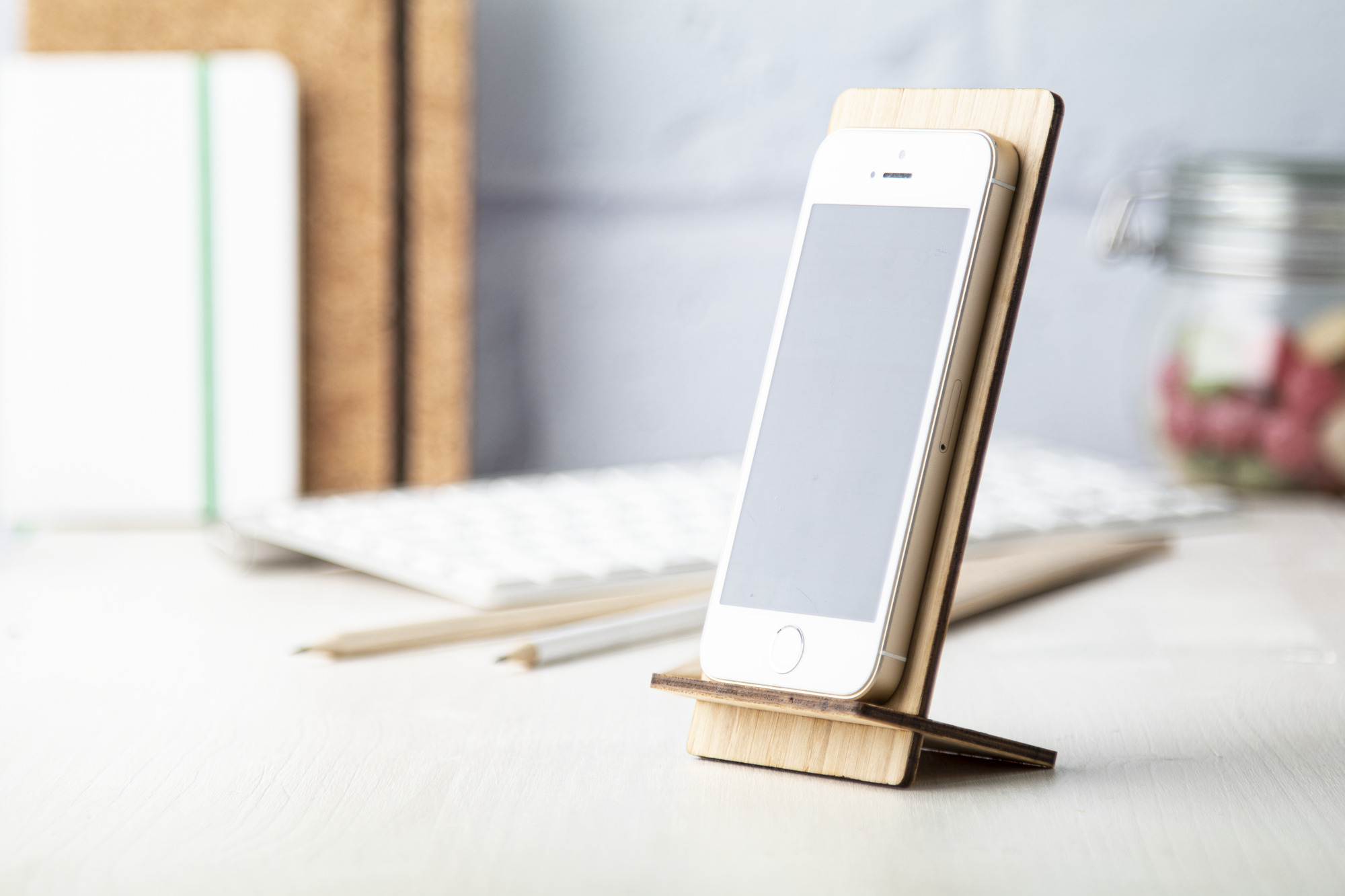 Portacellulare da scrivania in multistrato di bambù.