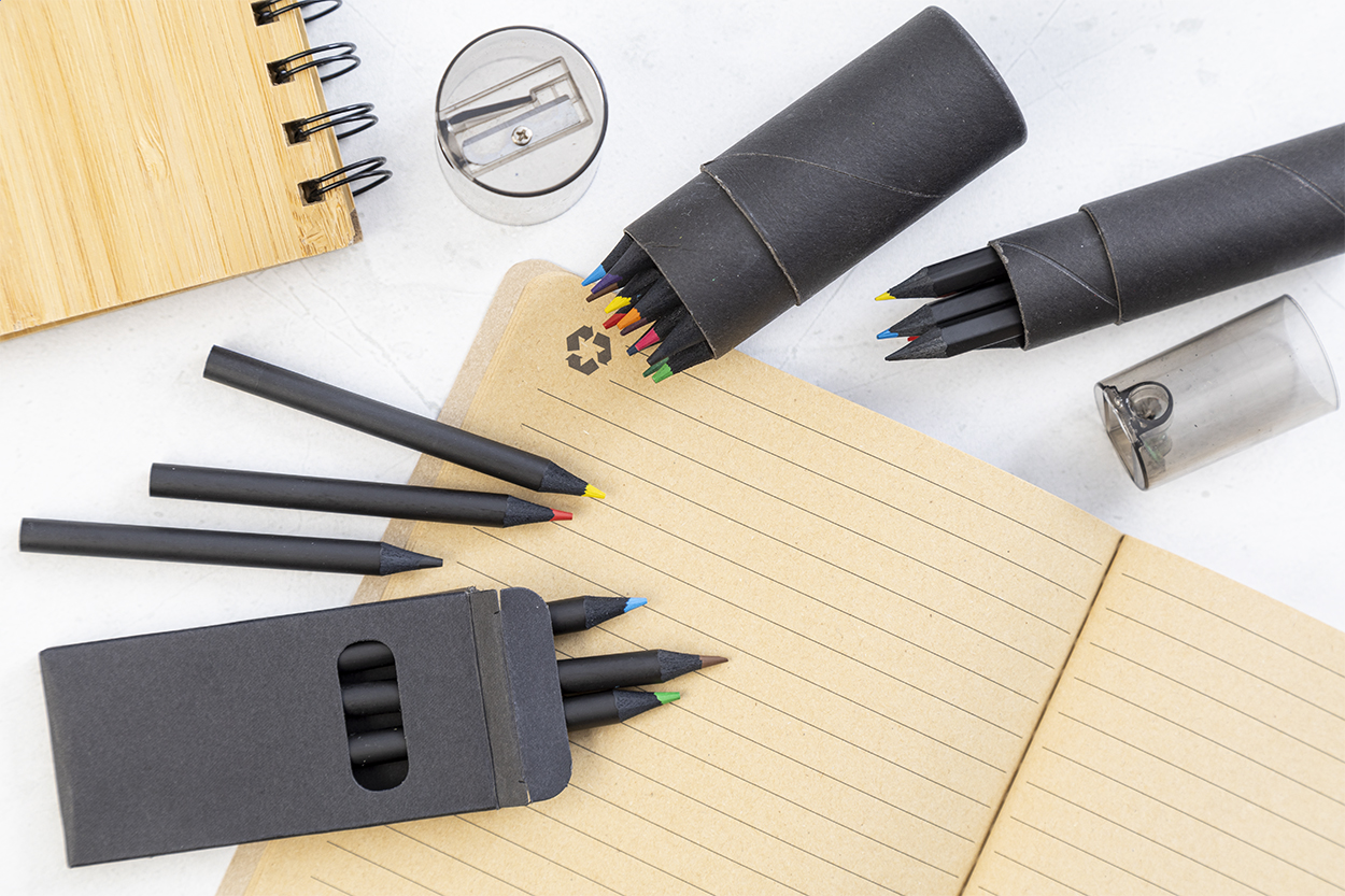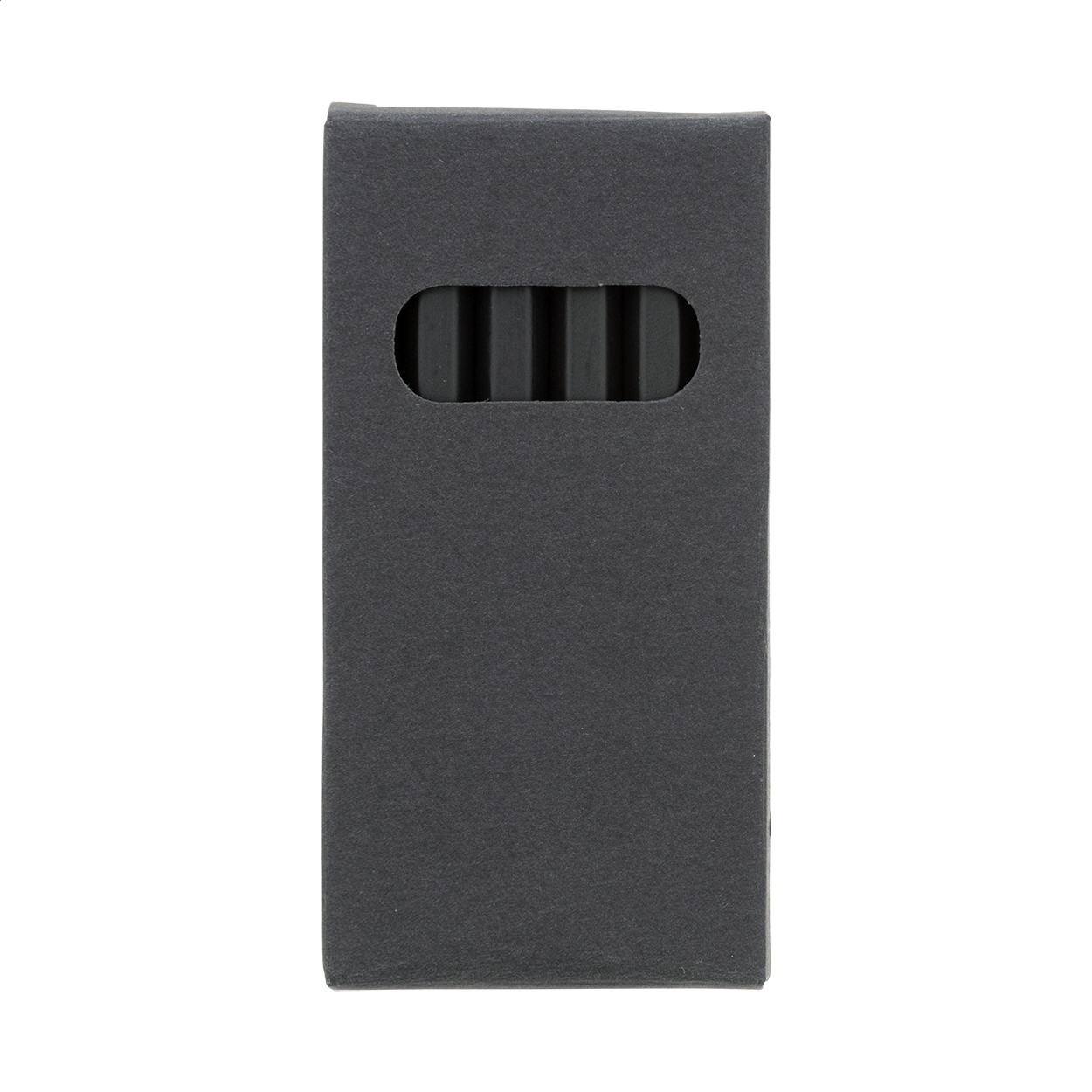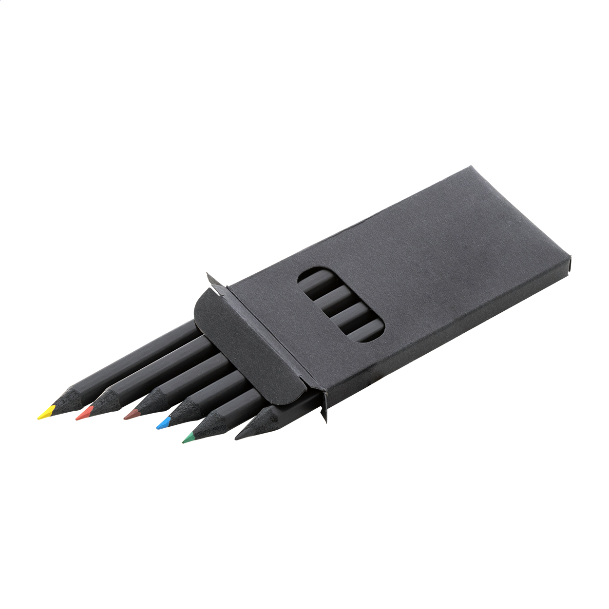 Set di 6 matite in legno nero contenute in una scatola di cartoncino nero.
