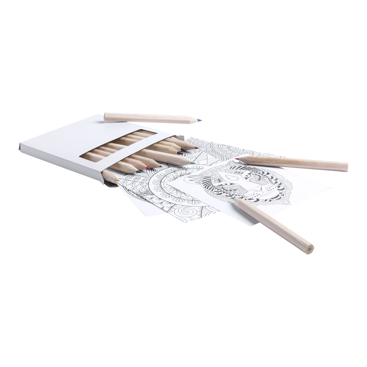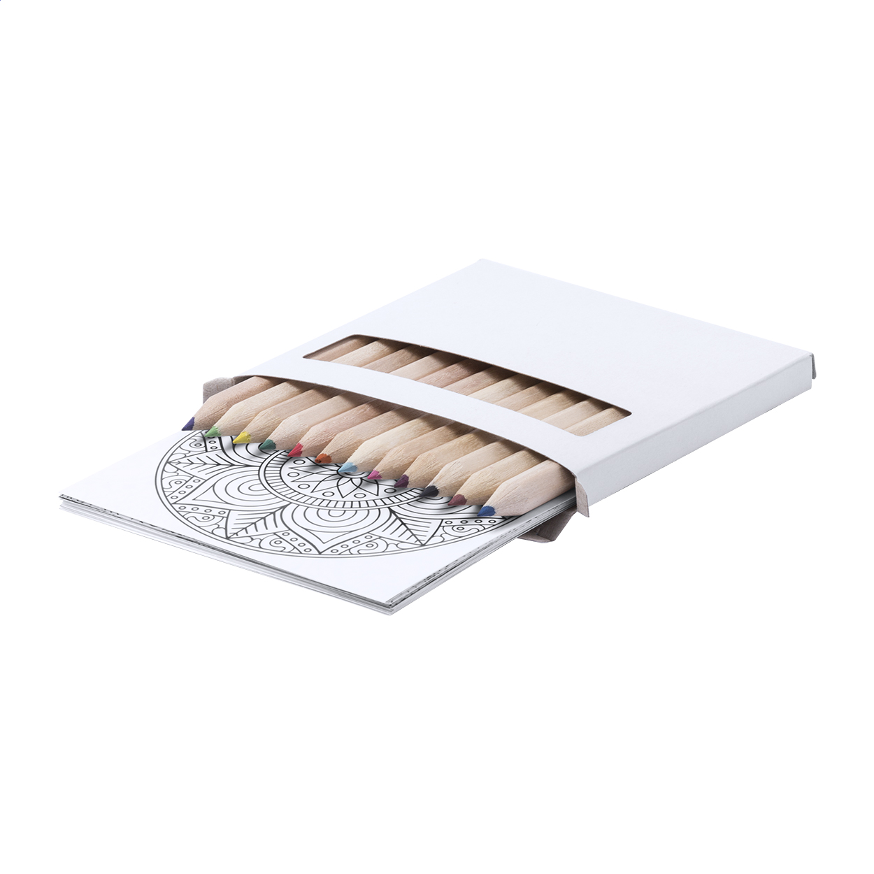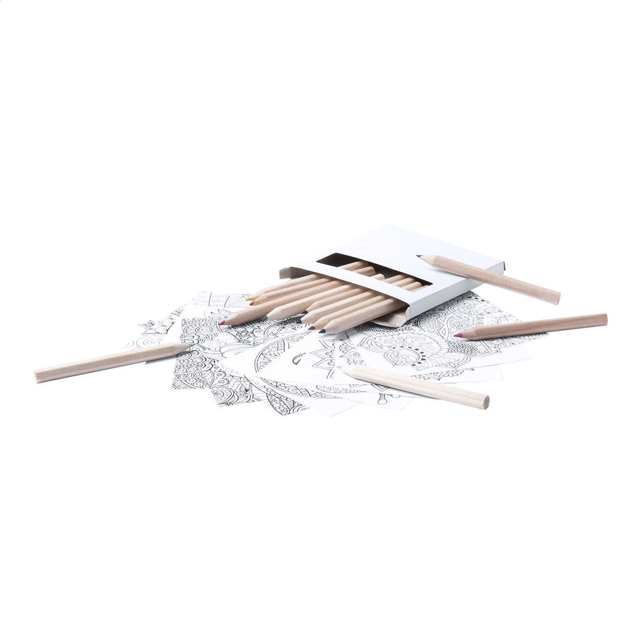 Set con 12 matite colorate e 12 fogli con disegni Mandala.