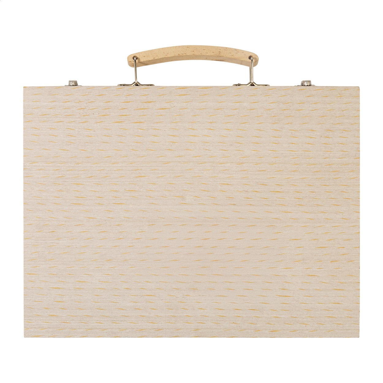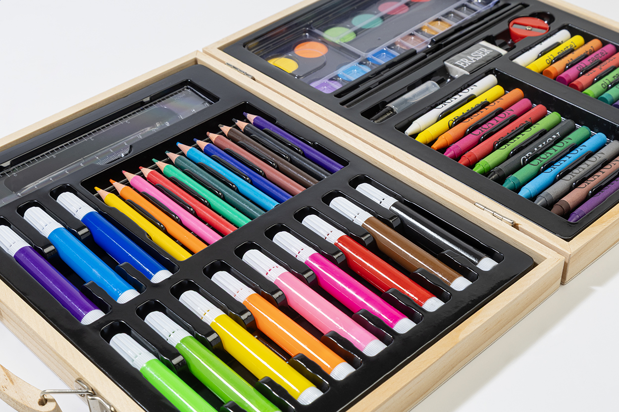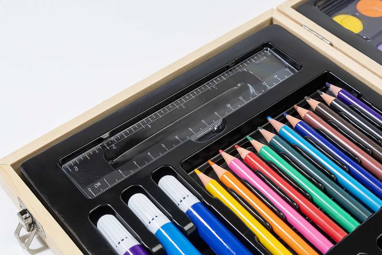 Set per disegnare composto da 66 pezzi contenuti in una valigetta di legno. Il set comprende: 12 pastelli a cera, 12 colori a olio, 12 matite, 12 pennarelli, 12 colori ad acquerello con tavolozza e pennello, righello, gomma, temperino e colla.