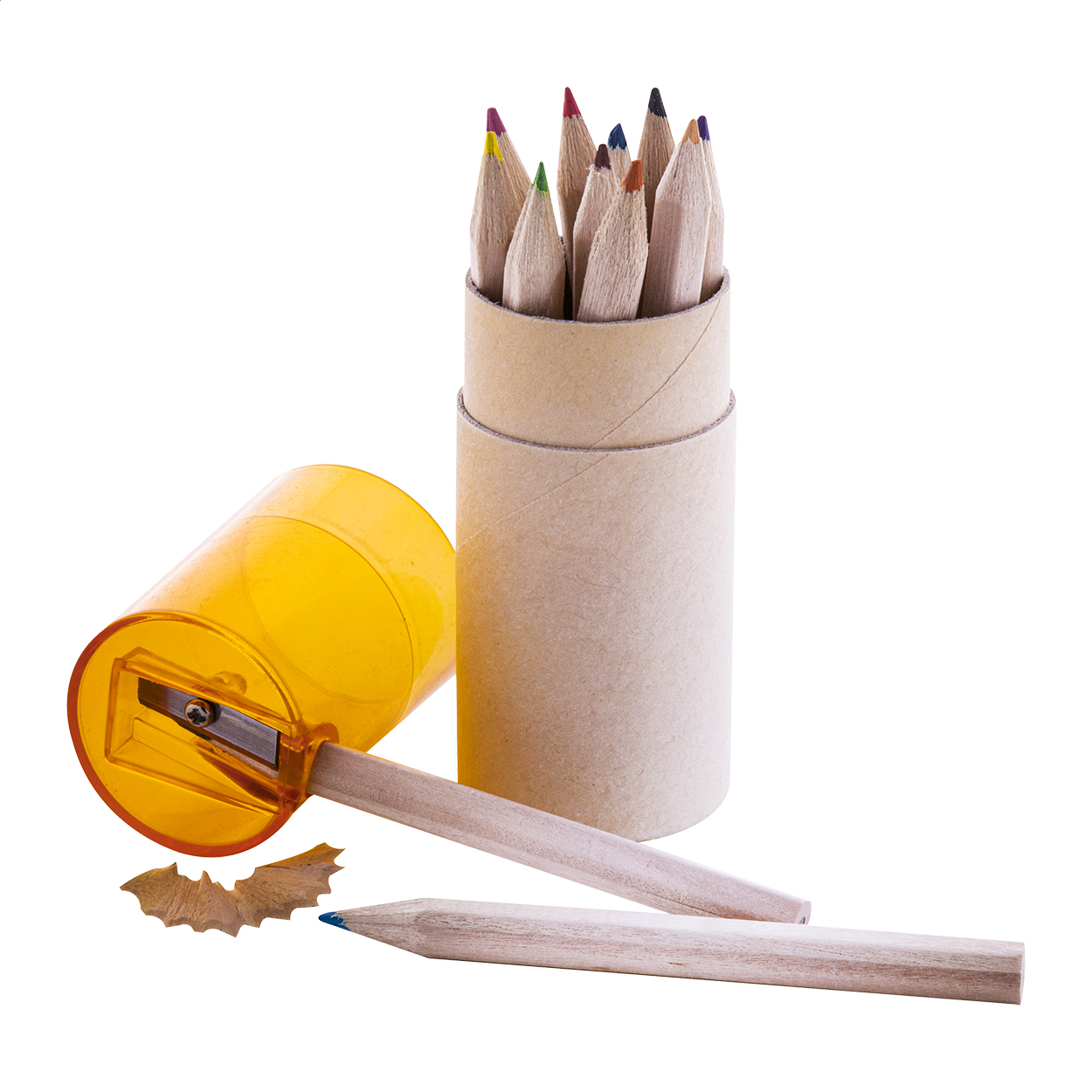 Set 12 matite colorate in confezione cilindrica in cartoncino con temperino in plastica.