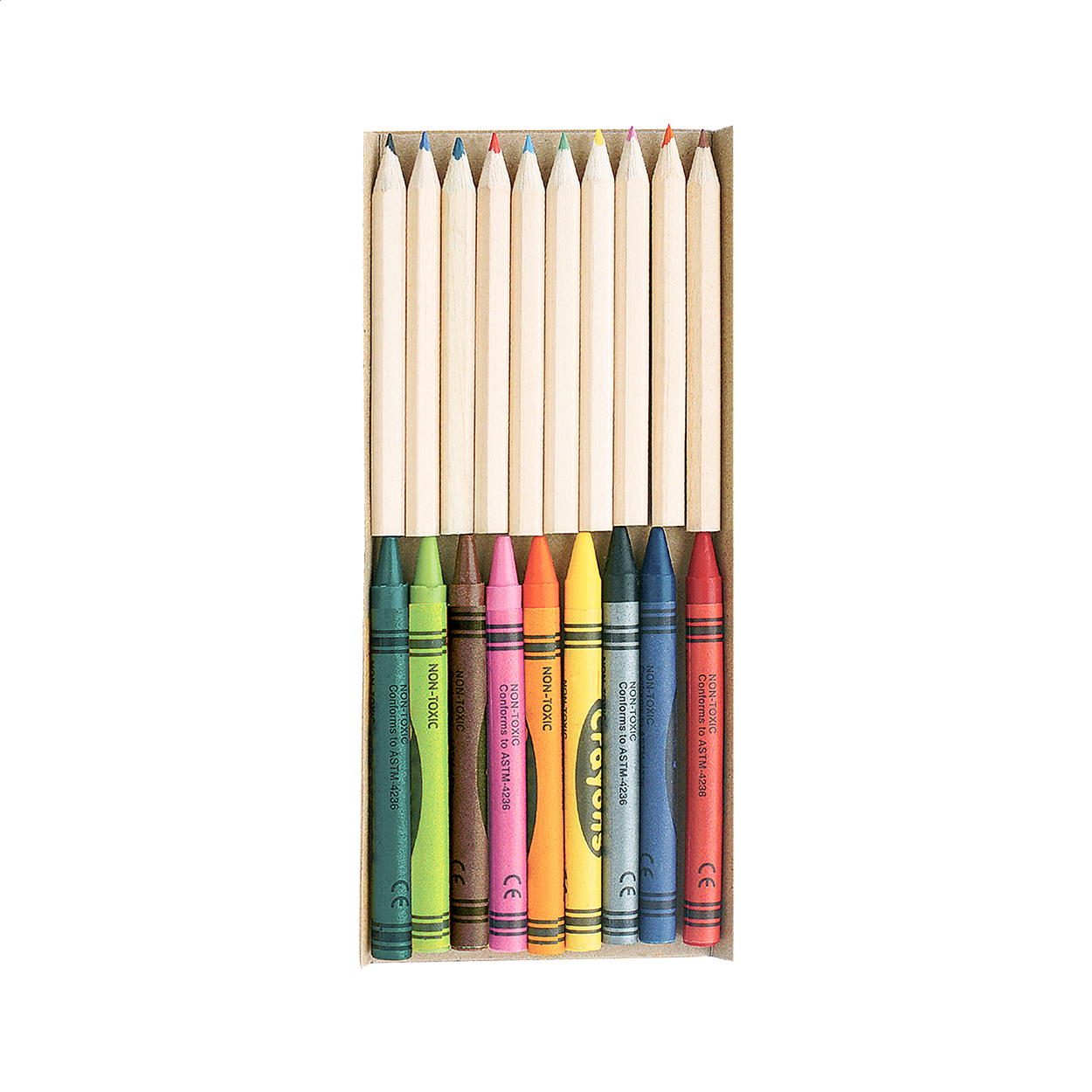 Set composto da matite colorate (10 pezzi) e pastelli (9 pezzi) in scatola di cartoncino riciclato con finestra.