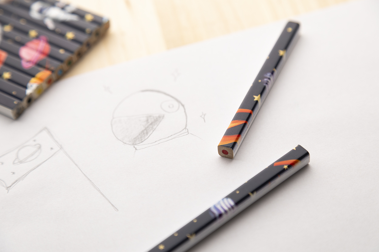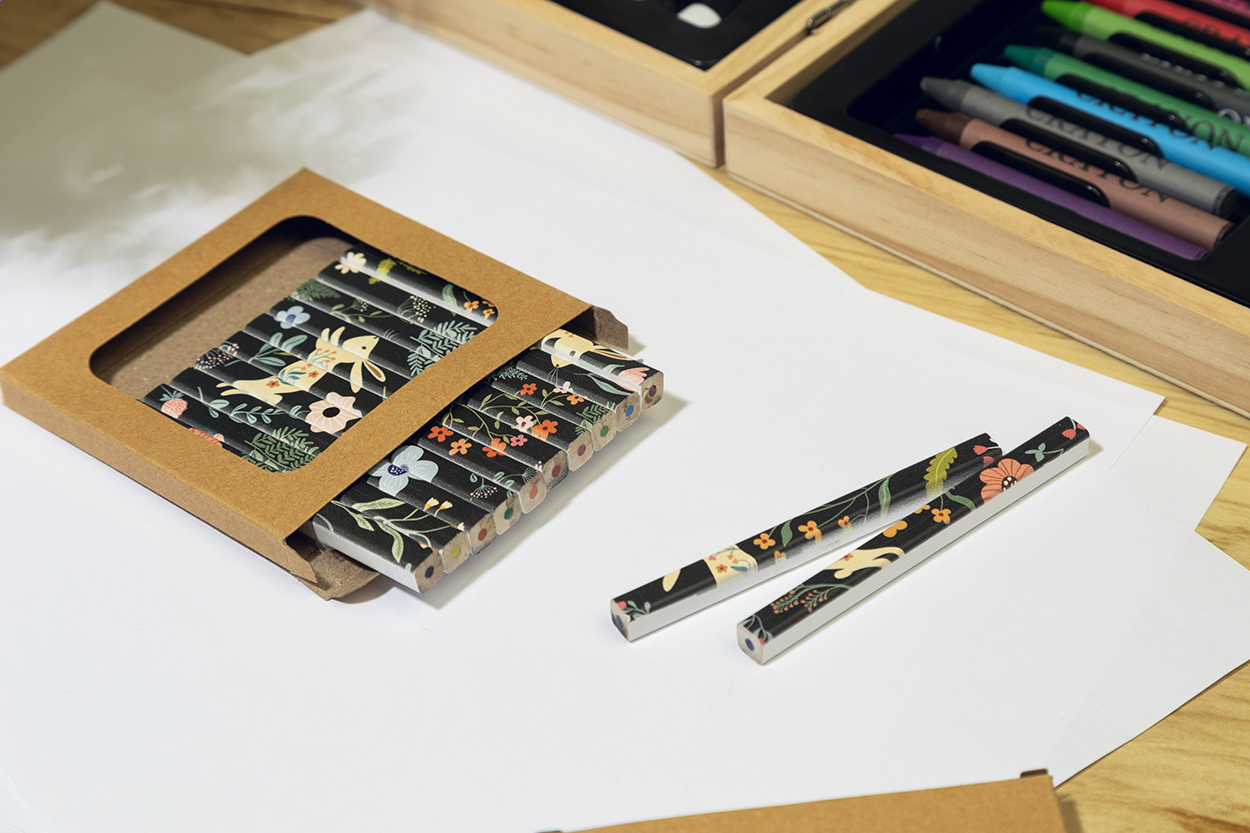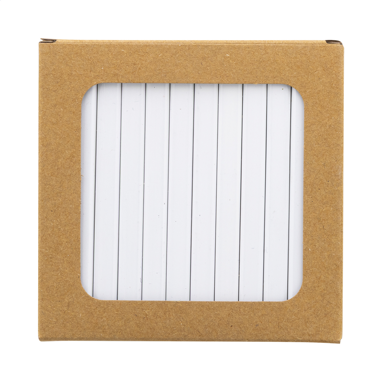Set di 12 matite colorate in legno di forma rettangolare con rivestimento bianco contenute in scatola di cartoncino kraft con ampia finestra. Ideale per la stampa UV LED su tutta la superficie.