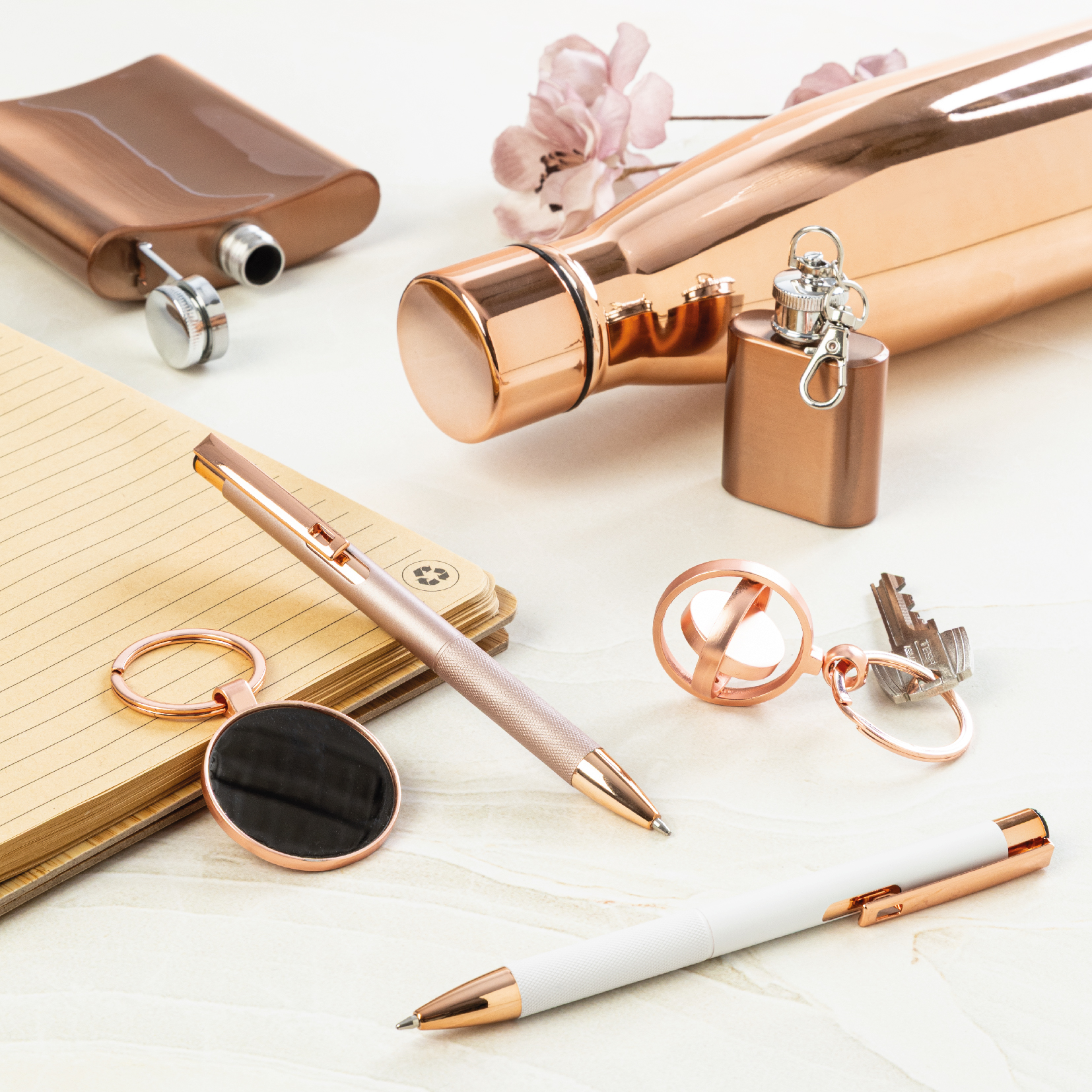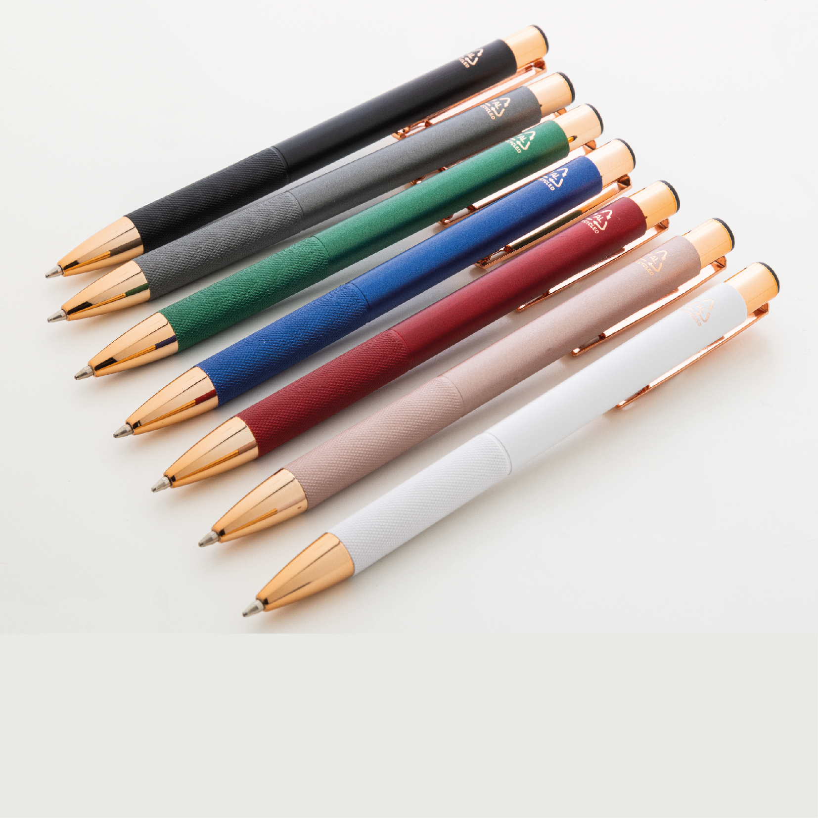 Penna a sfera in alluminio riciclato con corpo in finitura opaca, impugnatura testurizzata, dettagli in color oro rosa e refill blu.